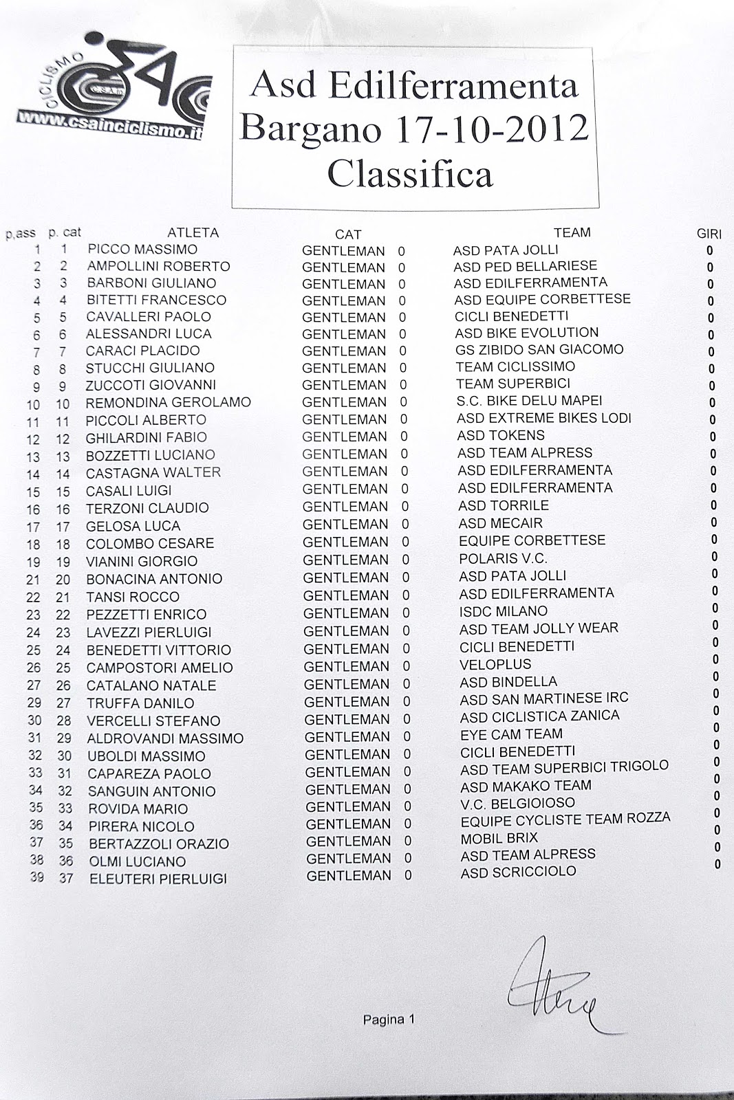 Infatti la prima tappa del 14 Ottobre a Gerenzago era sotto l'egida Acsi/Udace mentre le restanti quattro gare erano nel calendario della CSAin. Mettendo le gare in calendario a fine stagione, il rischio meteo era alto. A dispetto della denominazione, le prime tre tappe si sono corse con un clima decisamente primaverile ed hanno avuto un buon successo di partecipanti e di pubblico mentre per le ultime due si e' purtroppo assistito ad un brusco cambiamento del tempo con piogge insistenti e temperature invernali specie nella giornata di domenica.